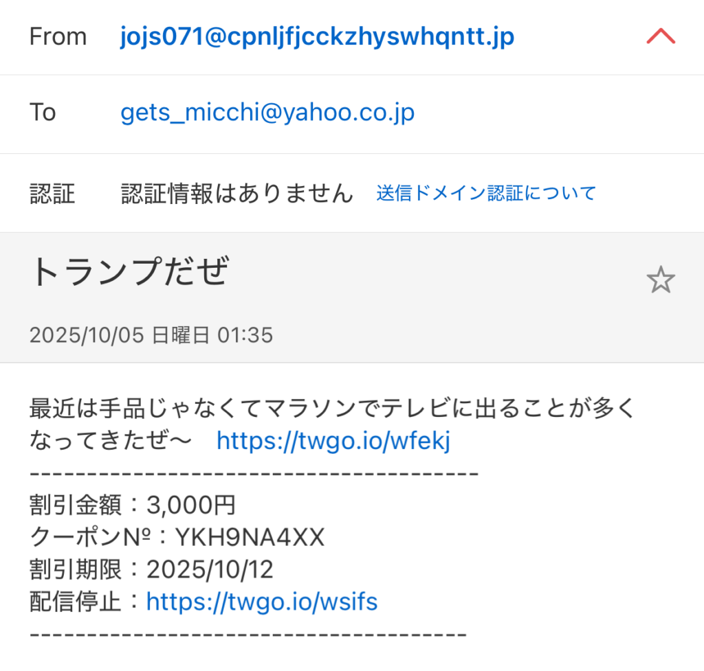 このように詐欺師たちが日々研鑽し手口を巧妙化させている中、方向性が180度違うよくわからないメールを送り付けてくるやつがいるんですよ。