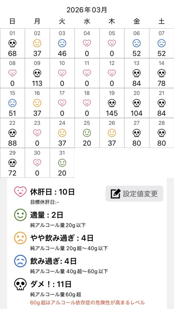 3月から休肝日を設けると同時に「節酒カレンダー」というアプリで記録することにした。